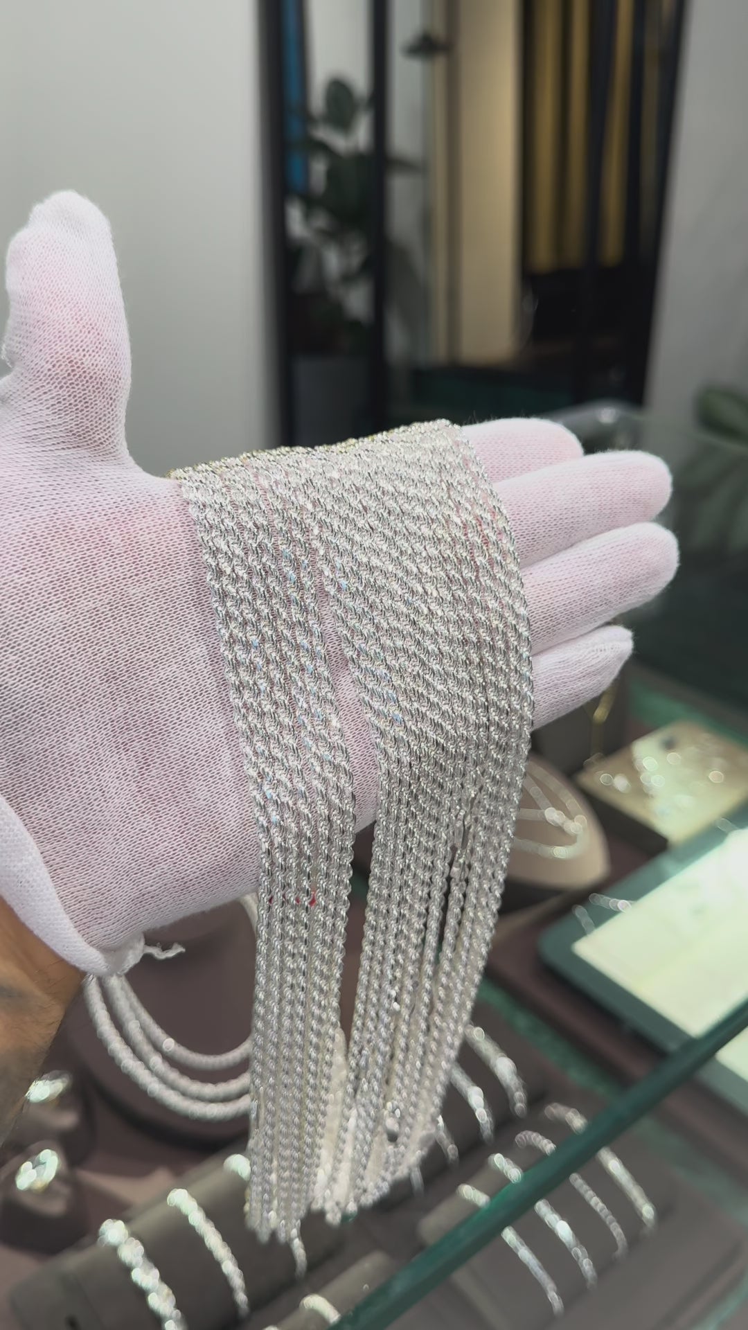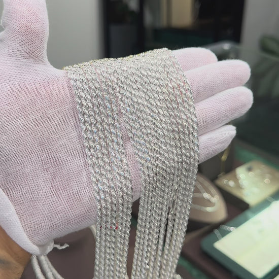 Each link is diamond-cut, a precision technique where fine facets are carved into the silver to create a surface that reflects light from every angle, giving the chain its signature sparkle.