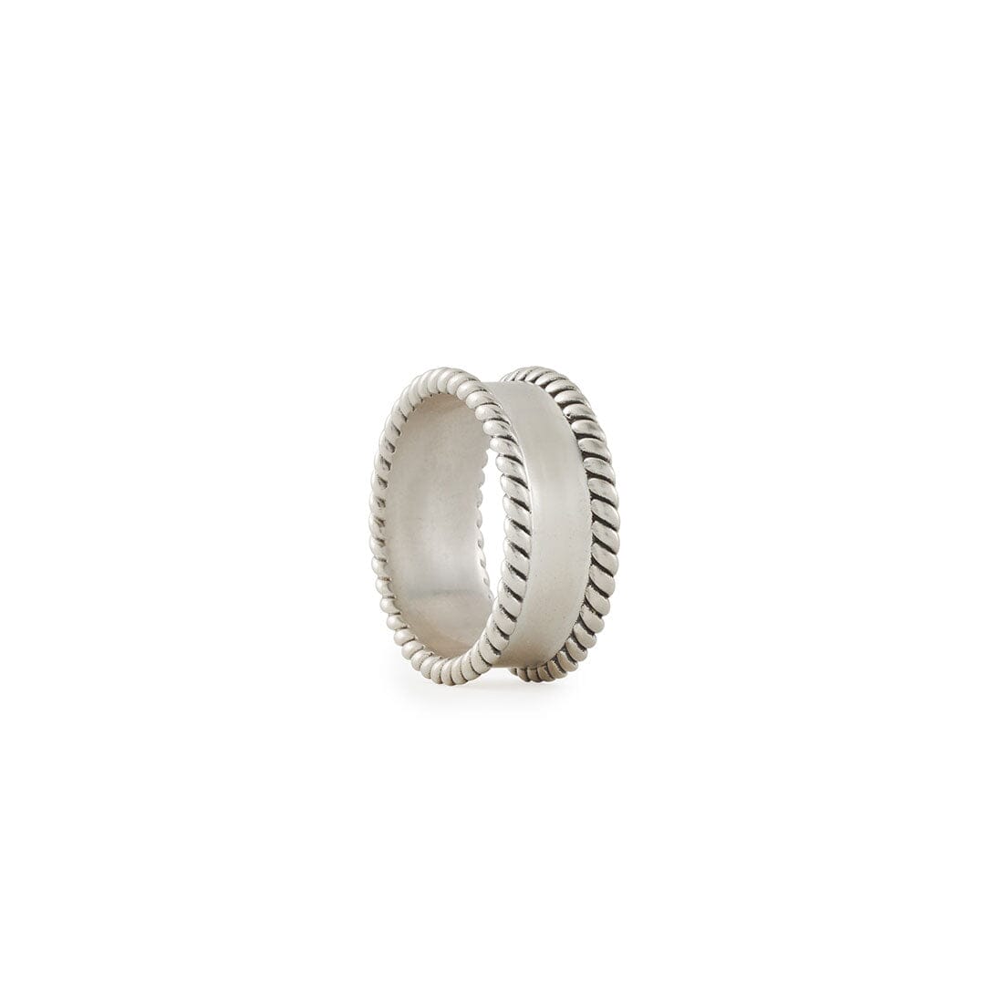The ring is a 9.5mm thick band ring with a rope design on the top and bottom borders. The main body of the ring is smooth & polished for a minimalist style. The inside of the ring is smooth for a comfortable fit and is finished with an oxidised effect for a vintage look.