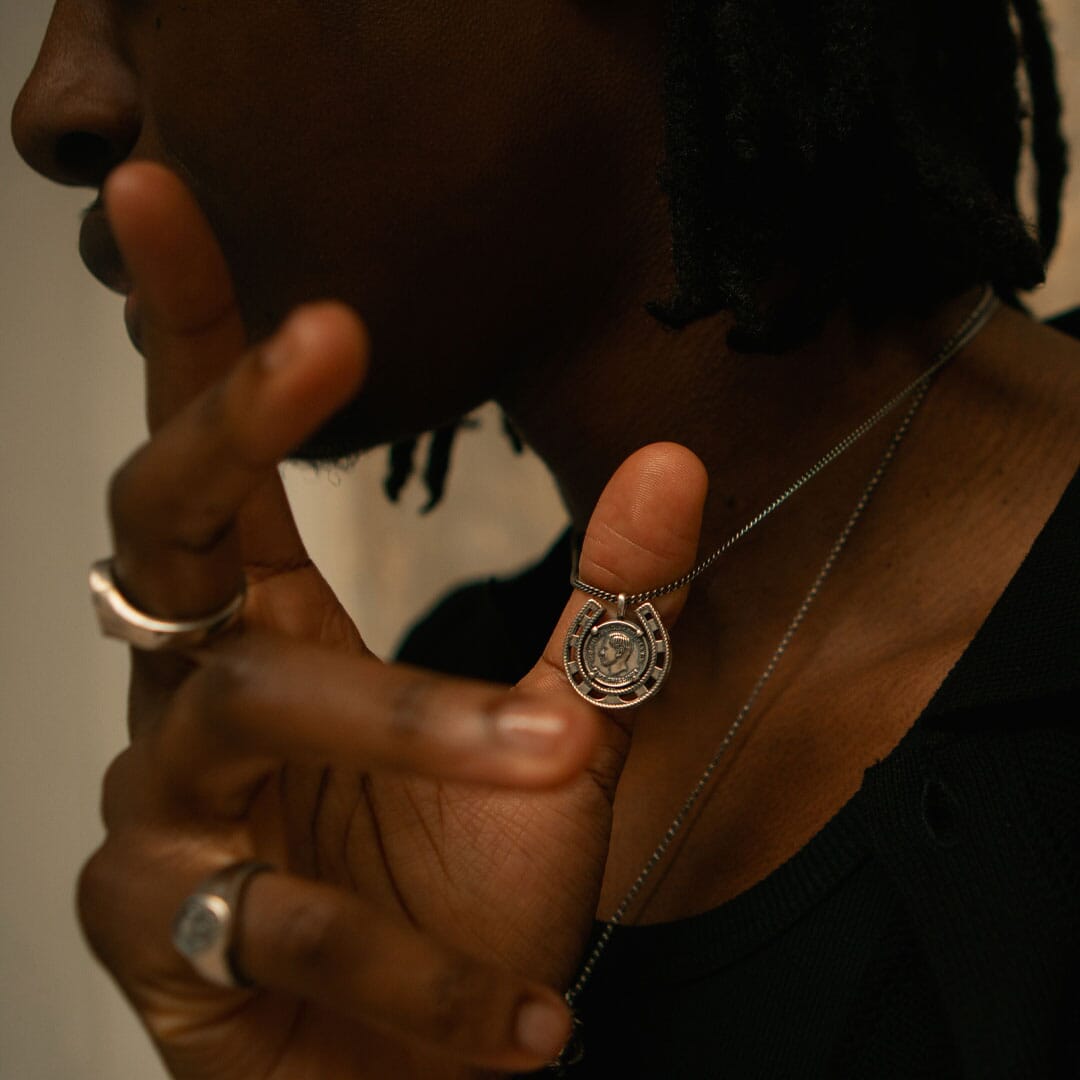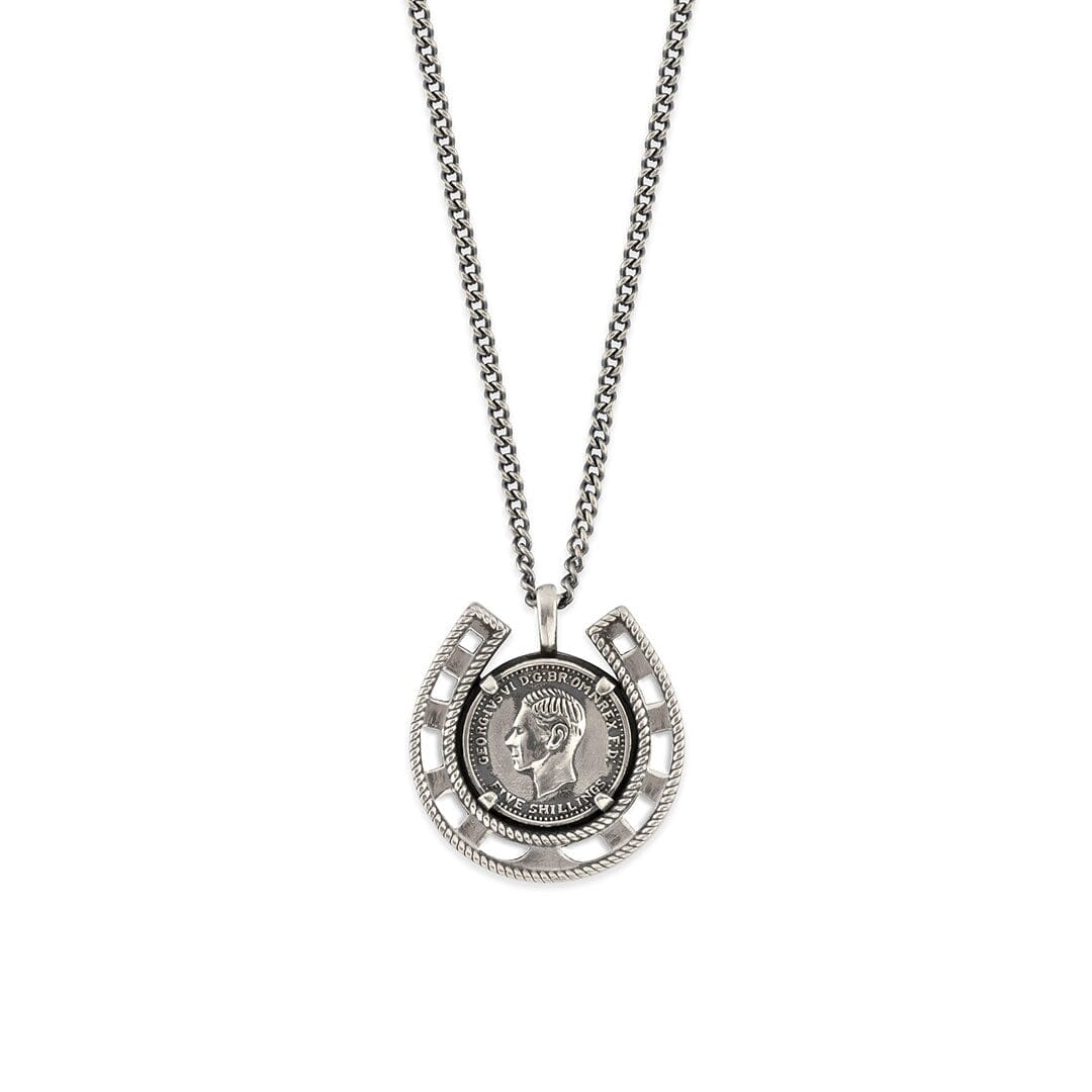 The Silver Horseshoe Necklace is a pendant necklace with an horseshoe pendant holding a sovereign coin and a fine chain. The necklace is made from 925 Sterling Silver, and is hallmarked by the Goldsmiths' Company Assay Office verifying its quality.
