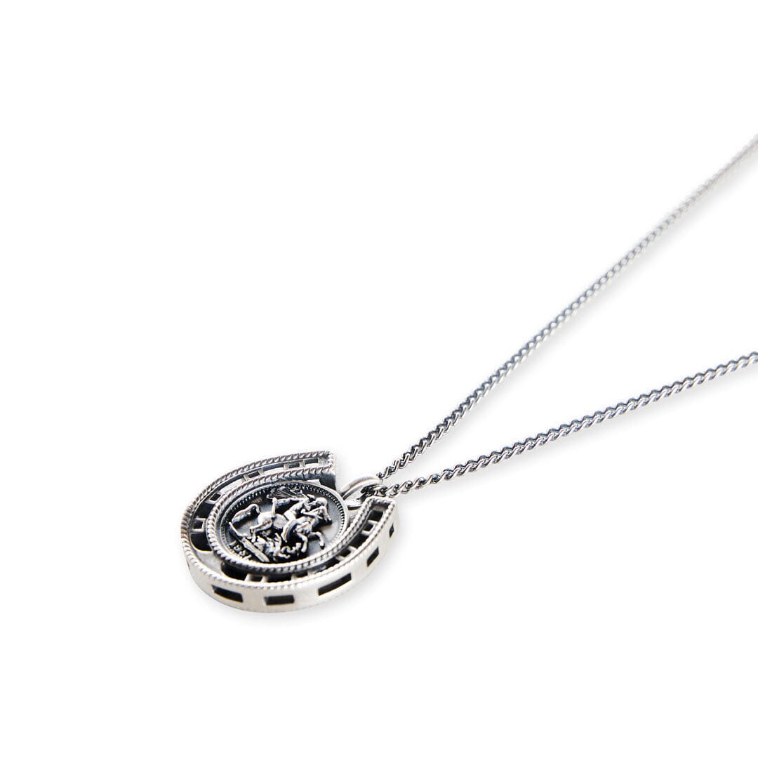 Horseshoe's symbolise good luck, prosperity and offer protection. The pendant is cast to an open horseshoe 'U' shape, bordered with rope style detailing. Inside the horseshoe is a replica sovereign coin. On one side is the classic depiction of King George VI and on the reverse is the depiction of Saint George slaying a dragon. Saint George is the patron saint of England and is known throughout history as a hero. Our Saints & Sinners collection is a play on stereotypes and looks at the ironic relationship between what's good & bad. Saint George held within a lucky horseshoe is the ultimate talisman for good luck and safety. The necklace has an oxidised finish, giving an aged, vintage look and highlighting the detail.